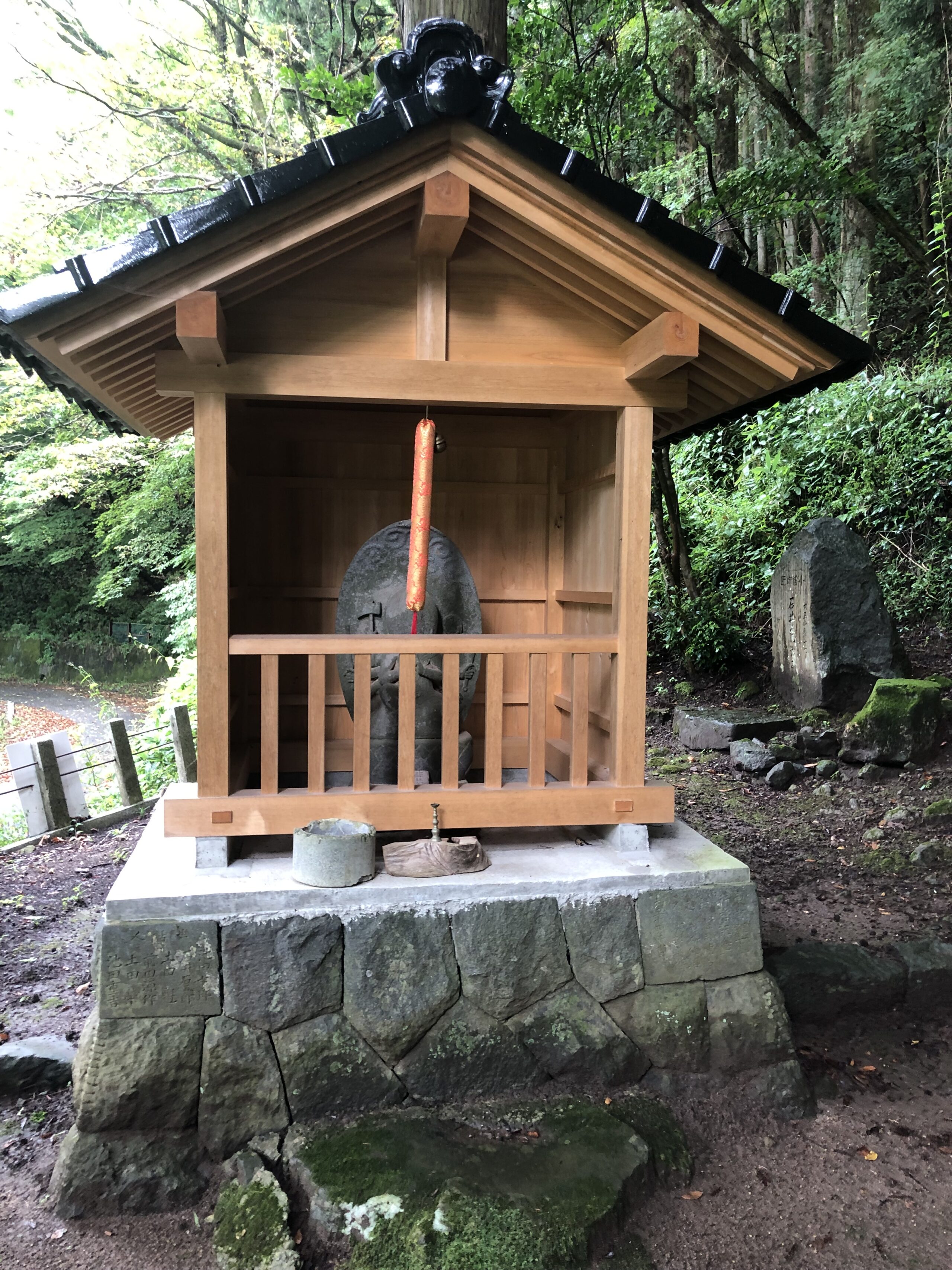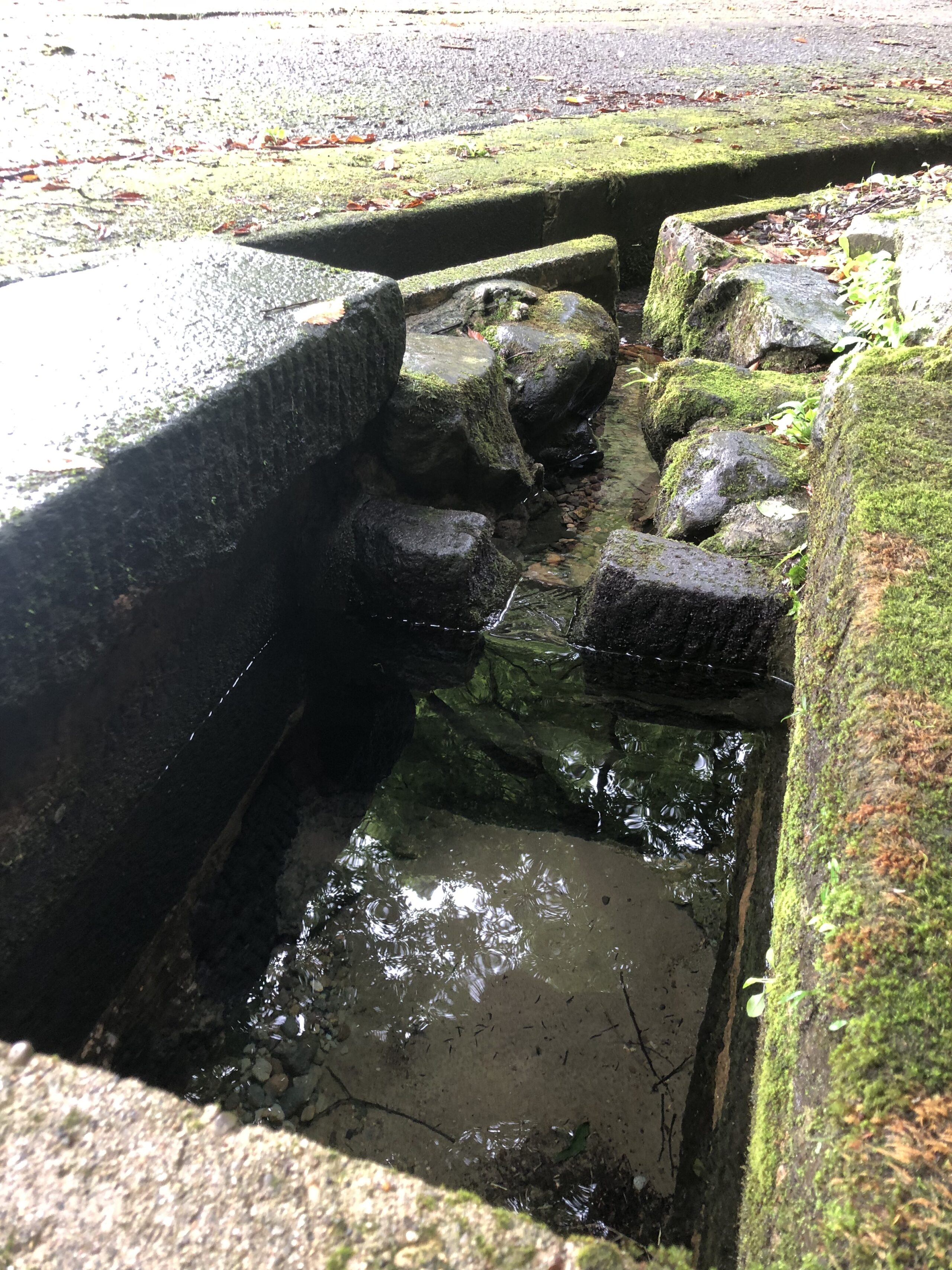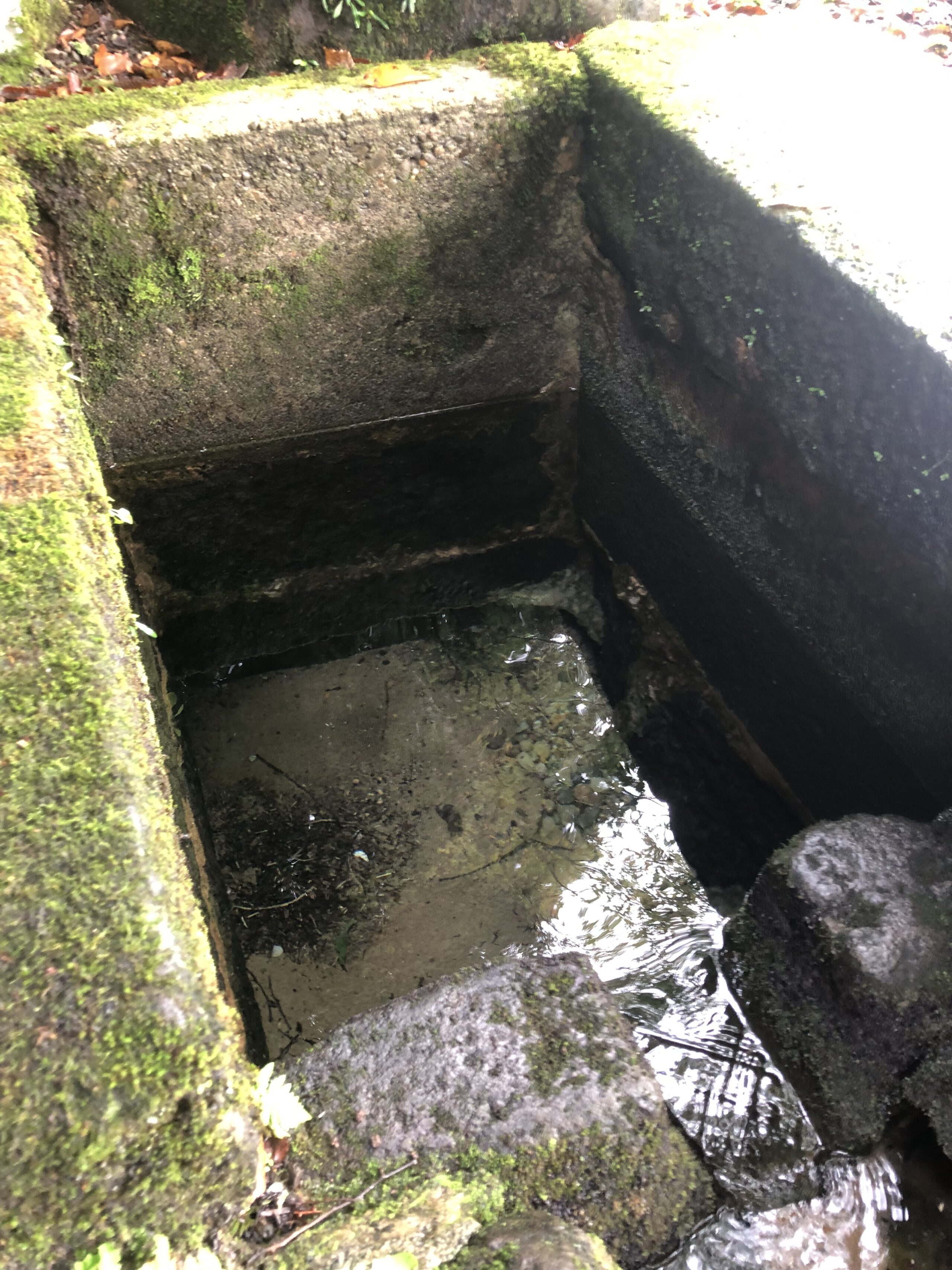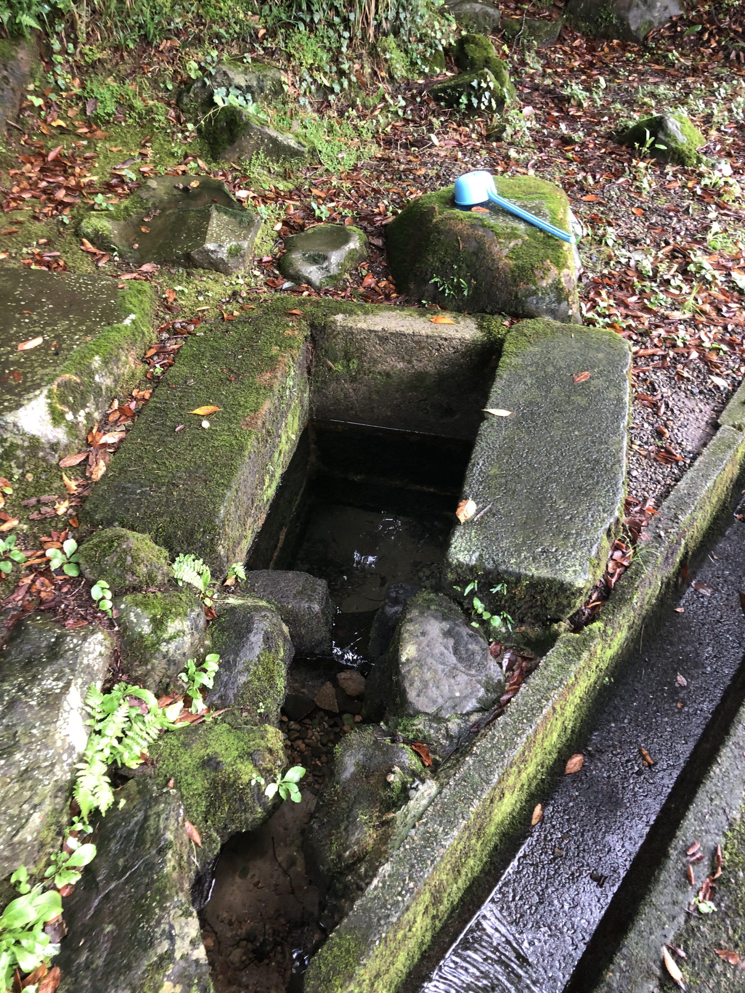 石で囲われた水場で、趣はありますが、地面よりも下に水場があるので、落ち葉🍂などが混ざる可能性あり。